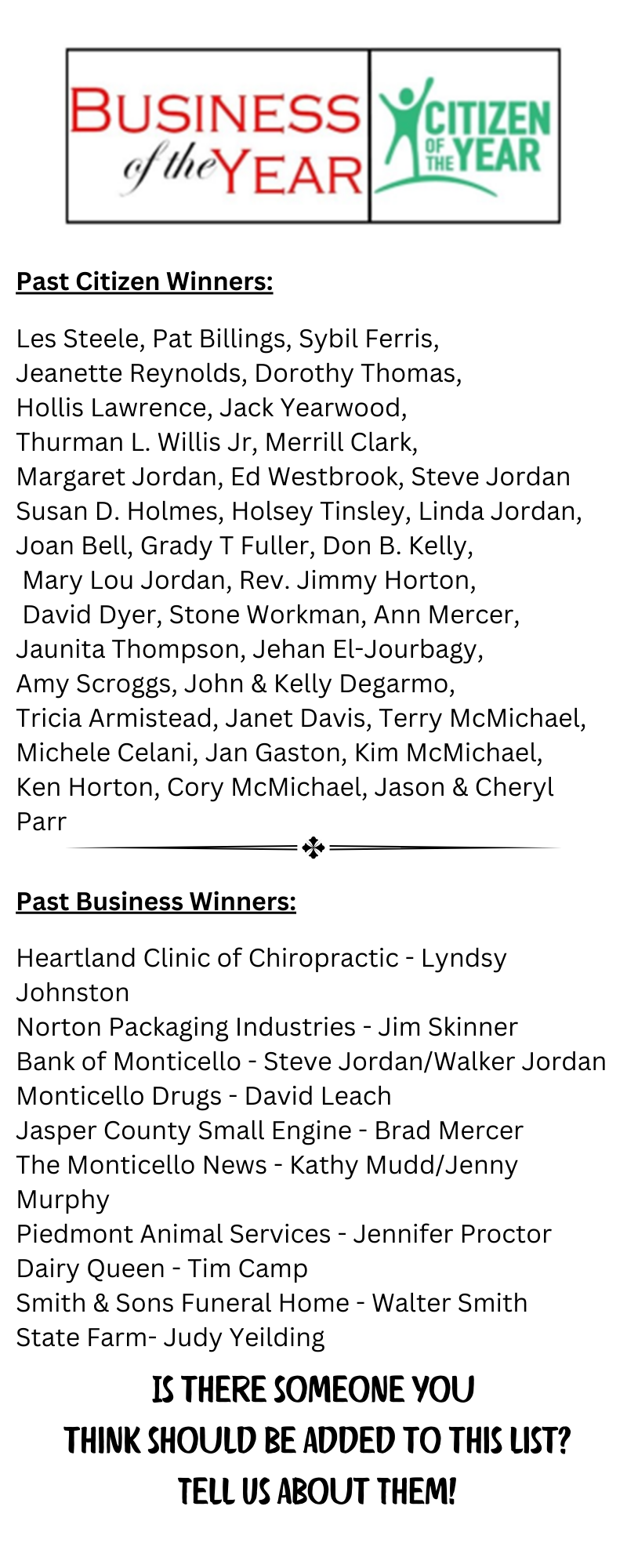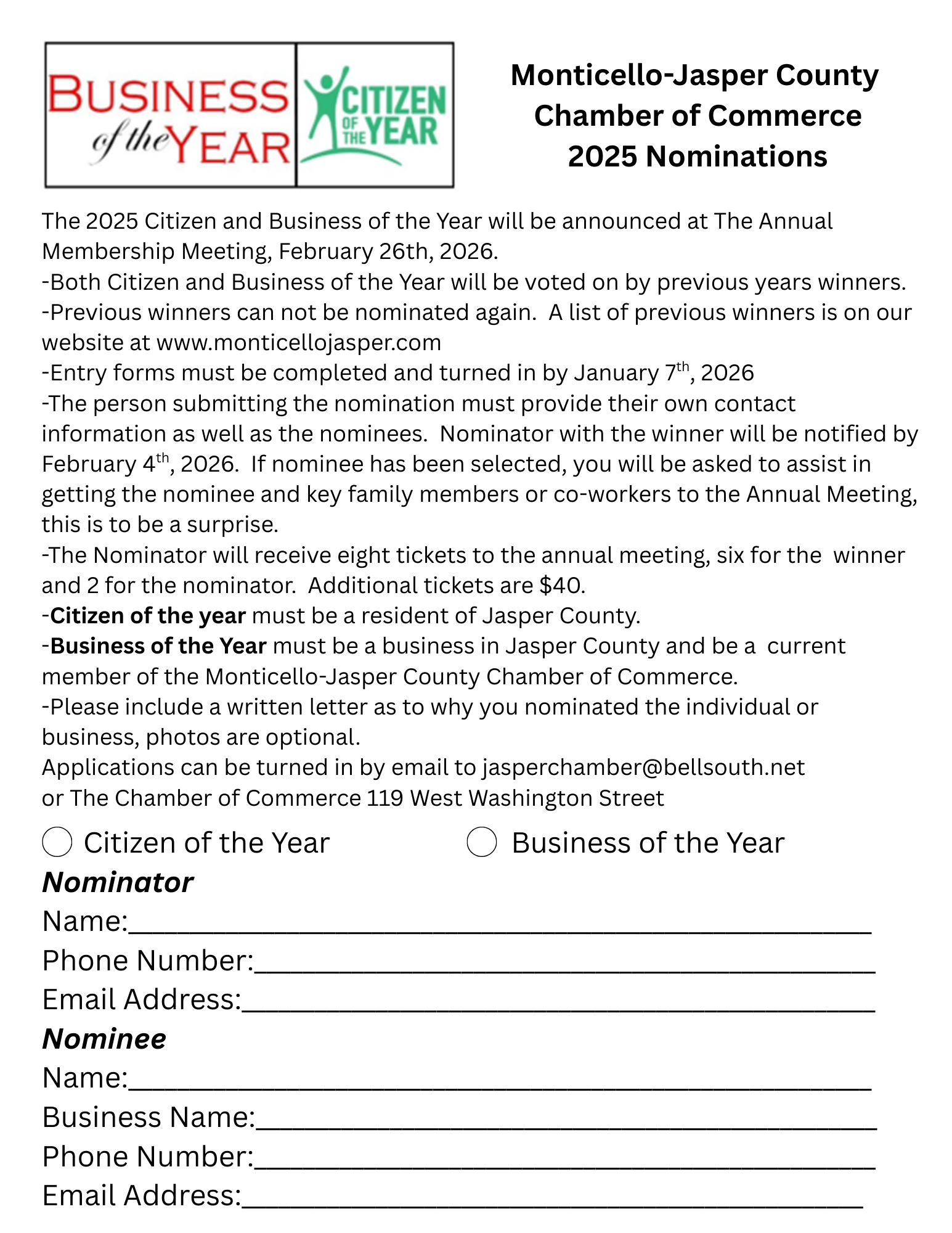 Nominations for 2025 Citizen of the Year and Business of the Year will open on December 1st, 2025 and close January 7th, 2026!